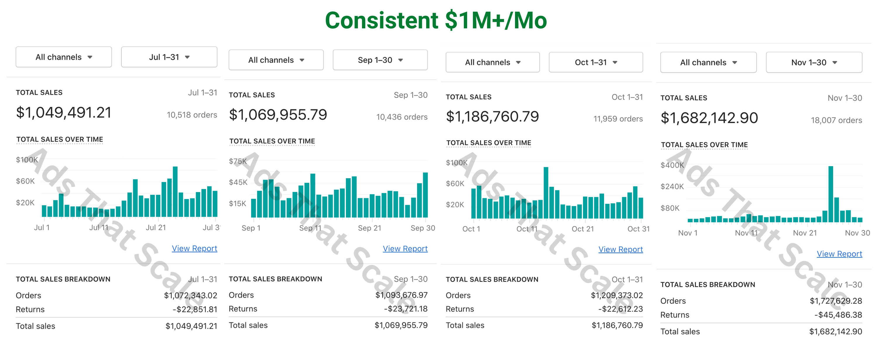 By month 3 (picture to the right of this text), we scaled the brand to $1Million dollars a month.